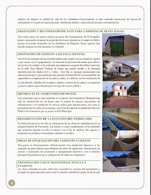 Entre los asuntos abordados está el Pabellón Polideportivo al que aún le falta el equipamiento y el pavimento valorado en 86.500€; la mejora de las instalaciones deportivas locales; la Expropiación del Parque de Los Cipreses que requiere 26.000€ para cerrar el proceso; el arreglo de las carreteras locales como el Camino Real, acceso peatonal a Traslasierra y el acceso a la piscina; la obra de peatonalización de la calle Sevilla; la Escuela de Empresas para ponerla a disposición de los emprendedores y realizar cursos de formación; la colocación de un Punto Limpio en la Planta de transferencias de RSU propiedad de Diputación; la construcción de una depuradora de aguas residuales; la instalación de un núcleo zoológico para perros y alejar el actual del casco urbano; Además, el Ayuntamiento ha puesto suelo a disposición de la Empresa Provincial de la Vivienda para la construcción viviendas protegidas para su venta o alquiler, entre otros.